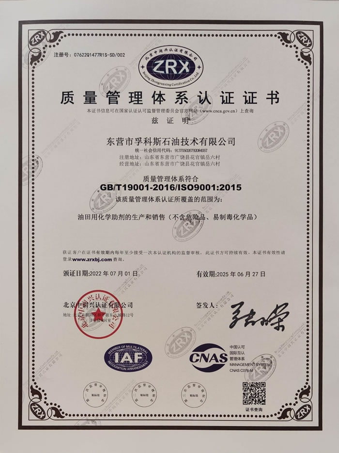 东营市孚科斯石油技术有限公司形成了完善齐全的生产管理制度、HSE管理制度、质量检验制度、财务管理等制度,建立了完善的生产管理、安全管理和质量管理体系,有效提高了产品的研发、生产能力。公司连续多年通过ISO质量体系认证,严格执行公司制度、客户要求、产品标准等,有效保障了公司产品质量和技术服务水平。公司成立质检化验室,建立了严格的原材料、产品、中间过程监测等检验制度,确保产品质量。公司成立了专业的售后服务队伍,对市场反馈的信息及时总结,以使我们的产品更好的满足现场的需求。